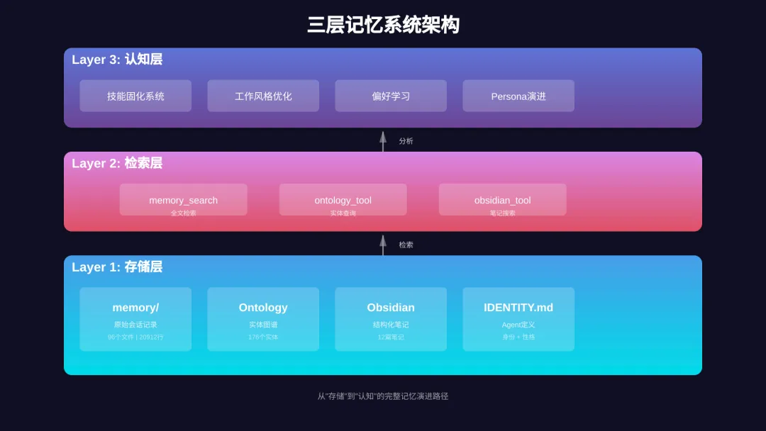 ✅ 保留原生方案的优势(MEMORY.md+ memory/ + memory_search) ✅ 补齐短板(Ontology + Obsidian + 认知层) ✅ 工具化实现(12个核心工具)