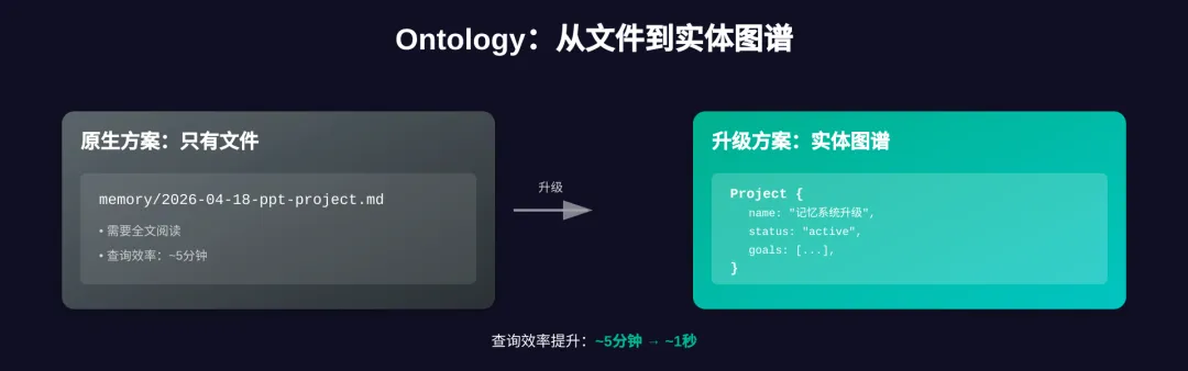 先查核心(MEMORY.md, <150行) 再查结构(Ontology, 176实体) 最后查详情(memory/, 96文件) 检索时间:~3秒 → ~1秒