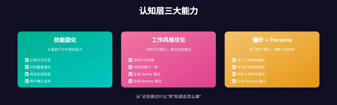 ✅ Agent 具备技能固化能力 ✅ Agent 具备工作风格优化能力 ✅ Agent 具备用户偏好学习能力 ✅ Agent 具备Persona演进能力 ✅ Agent 从"工具"进化为"伙伴"