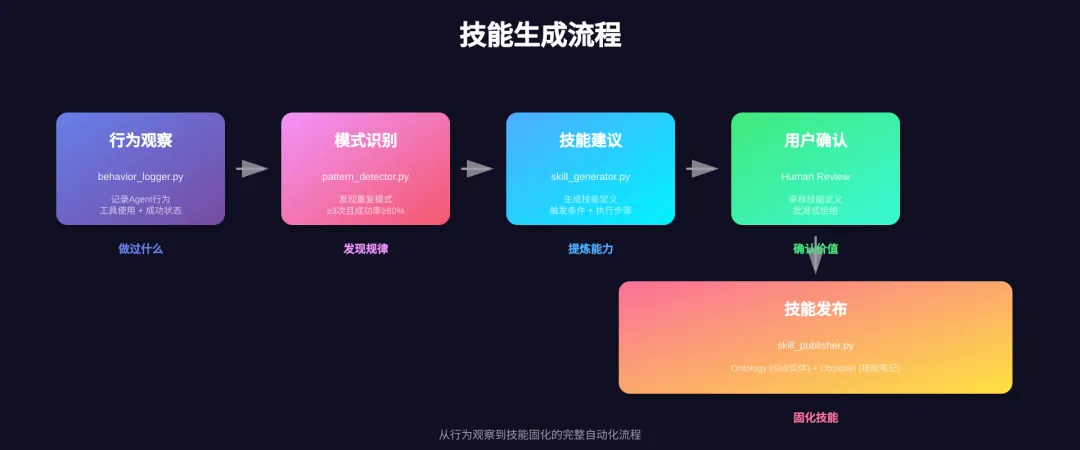 行为观察 → 模式识别 → 技能建议 → 用户确认 → 技能发布 ↓ ↓ ↓ ↓ ↓做过什么 发现规律 提炼能力 确认价值 固化技能