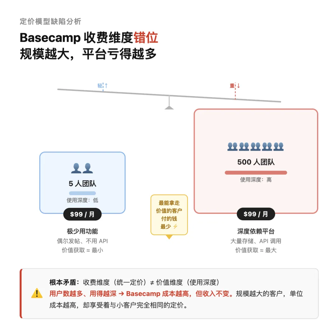 出发点很好:简单、透明、对用户友好。但 5 人团队和 500 人团队付一样的钱——最能从产品里拿到价值的客户,付的钱最少。