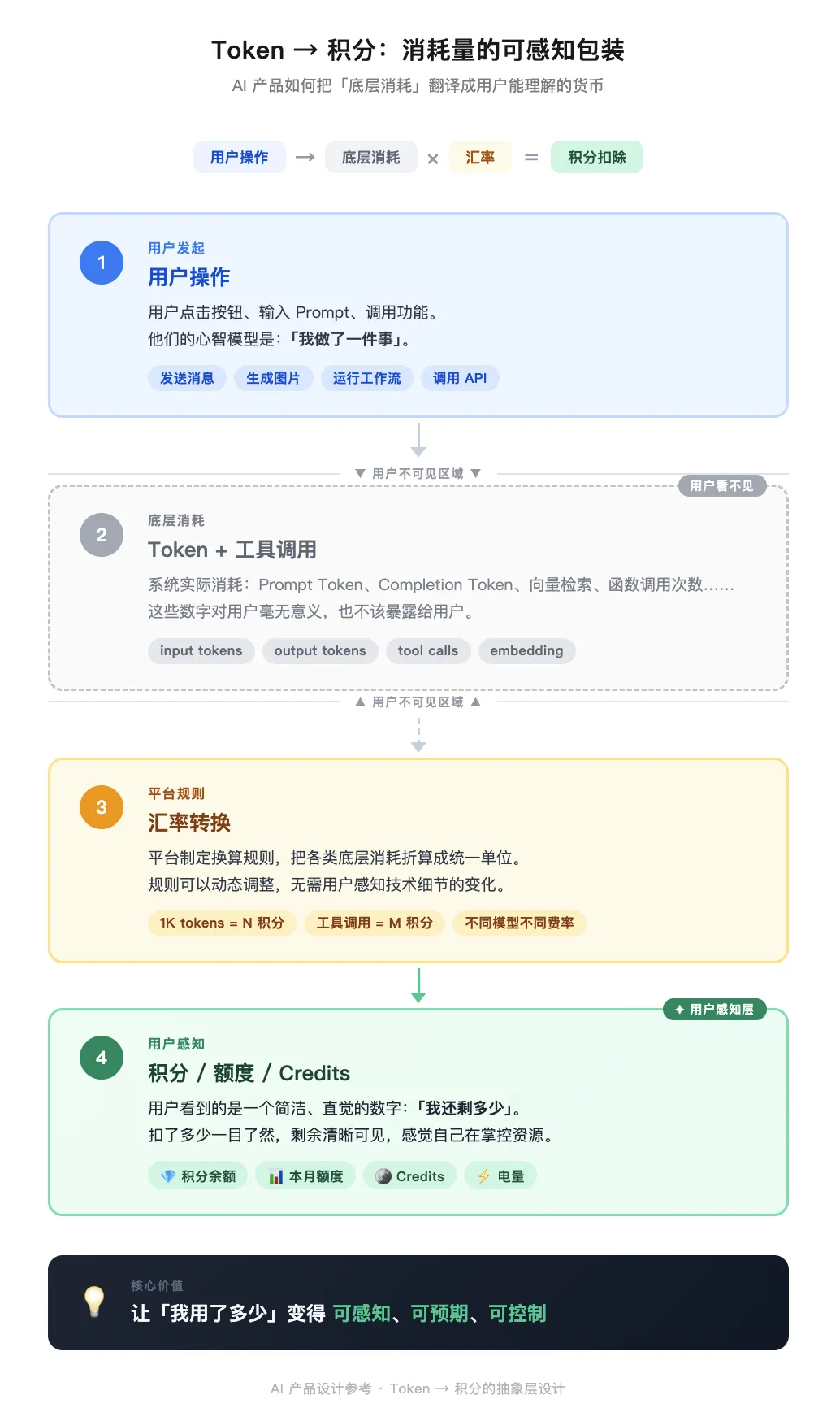 这一层不是噱头。它在解决一个真实的感知问题:让「我用了多少」变得可感知、可预期、可控制。用户愿意为看得见的东西付钱,不愿意为「不知道会烧多少」的黑箱买单。