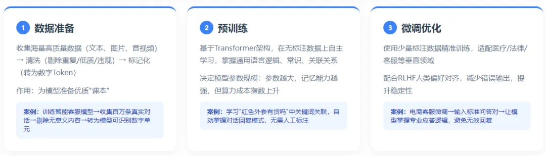 大模型训练的本质可理解为"通过海量数据学习规律",这与人类"通过阅读获取知识"的过程异曲同工。整个过程可归纳为三个核心步骤:数据准备:先收集海量高质量数据(文本、图片、音视频等),再做清洗(剔除重复、低质、违规内容),最后进行标记化处理【将文本、图片等转化为模型可识别的数字单元】,把文字转化为模型能识别的数字单元,相当于给模型“准备优质课本”。案例:训练一个智能客服大模型,会收集百万条真实客服对话(如“我的订单怎么退款”“物流多久到”),剔除无意义对话(如“哈哈”“哦”),再将对话转化为模型可识别的Token(数字单元),供后续学习。预训练:基于Transformer架构【大模型的核心基础架构,好比大模型的“大脑”,负责处理数据关联关系】,让模型在无标注数据【未人工标记类别、答案的原始数据】上自主学习,核心是掌握通用规律(比如语言逻辑、常识、结构关系)。这一步会同时决定模型的参数规模【模型中可调整的权重数量,决定模型记忆和拟合能力】,参数越大,理论上记忆与拟合能力越强,但算力、推理成本也会指数级上升。案例:在预训练阶段,当模型接收到"我想买一件红色的外套,请问有货吗?"这样的输入时,它会自动学习"红色"、"外套"和"有货吗"这些关键词之间的关联,同时掌握此类询问的典型回复模式(例如"有的,请问需要什么尺码?")。整个过程无需人工提供标注答案。微调优化:通过少量标注数据(人工标记的类别和答案,用于精准优化模型的数据集,如行业对话和任务示例)进行持续训练,可使模型更好地适应特定领域( 如医疗、法律、客服 ),这类似于"大学选择专业进行深造"。同时,采用人类偏好对齐技术(RLHF,即通过强化学习从人类反馈中学习,使模型输出更符合人类需求),能有效减少错误输出,提高结果的稳定性。案例:在电商客服场景微调中,我们将向模型输入标注好的对话样本(如用户提问:"订单退款多久到账?",对应标准回复:"退款将在1-3个工作日到账,款项将原路退回您的支付账户")。通过这种训练方式,使模型掌握电商场景的专业应答逻辑,避免生成"不清楚"或"请咨询客服"等无效回复。训练的核心在于数据质量而非数量,同时需要强大的算力支持(通常采用GPU集群来实现模型训练/推理的计算需求)。大多数企业不会从零开始训练大模型,而是基于开源基座(指开源的基础大模型,可在其基础上进行微调优化以降低开发成本)进行微调。案例:某初创公司计划开发智能办公助手,他们不打算从零开始训练模型,而是选择基于开源基座模型Llama2进行微调。通过使用公司内部的办公文档、会议纪要等数据,快速适配特定办公场景。这种方法能显著降低开发成本并缩短项目周期。二、大模型如何推理生成答案?