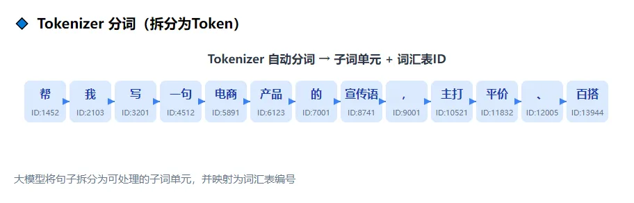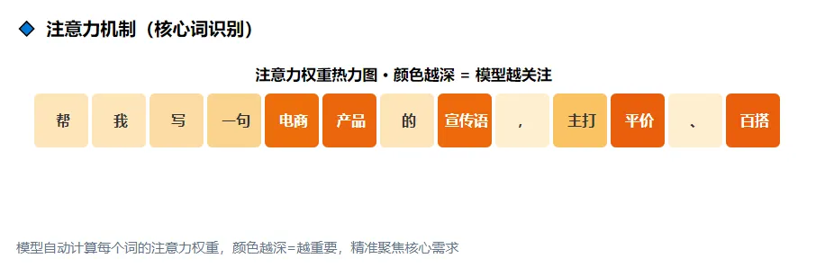 推理(即大模型接收输入后生成输出的过程)并非"模型在思考",而是通过训练获得的概率规律,通过逐词预测生成最合理回答的运算过程。让我们具体分析一下与AI对话的交互过程,如下所示:输入编码:将用户输入的提示词(Prompt)转换为模型可识别的向量(即模型能够理解的数字化表示形式),并根据上下文长度限制对历史对话进行截断或保留处理。注意力机制(Transformer架构的核心组件):通过分析输入内容的关联关系和重点信息,帮助模型准确识别问题核心并保持上下文连贯,有效避免答非所问的情况。逐词概率预测:每次只预测下一个最可能出现的词,循环生成直到结束。输出解码:将模型生成的数字向量转换为自然语言文本。通过调节温度参数(temperature)可控制输出的随机性:数值越高输出越多样化,数值越低则越精准稳定。我们模拟一个实际应用场景:用户在AI聊天窗口输入"帮我写一句电商产品的宣传语,主打平价、百搭",AI系统完整的响应流程如下:1.输入编码:将用户输入的这句话(“帮我写一句电商产品的宣传语,主打平价、百搭”)转化为模型可识别的向量;2.注意力机制:模型识别出核心关键词——“电商产品宣传语”“平价”“百搭”,明确用户需求是生成贴合这两个核心卖点的宣传语,忽略无关信息;