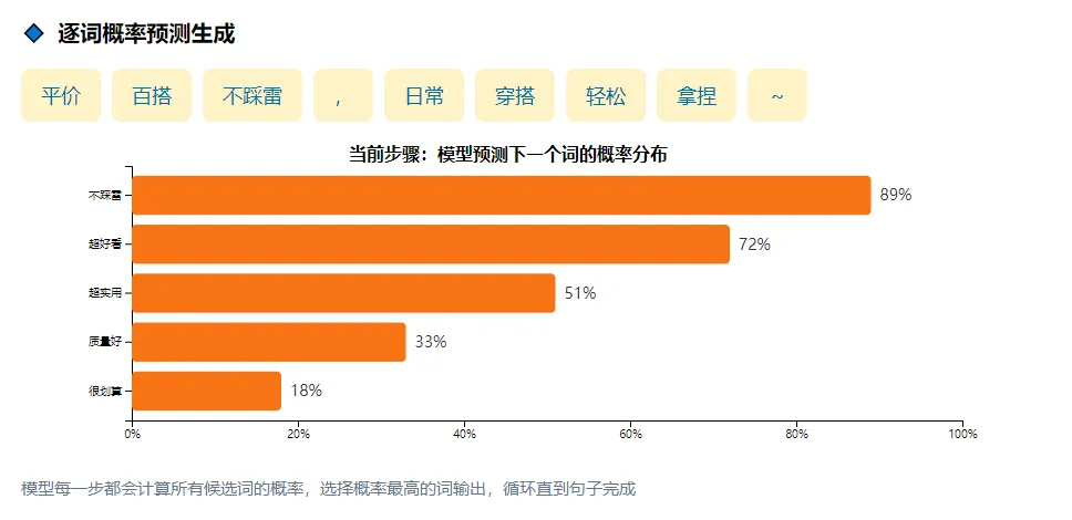 3.逐词概率预测:模型基于训练时学到的“宣传语规律”,先预测第一个词“平价”(概率最高),再预测下一个词“百搭”,接着预测“不踩雷”(贴合宣传语语气),循环预测直到生成完整句子“平价百搭不踩雷,日常穿搭轻松拿捏~”;