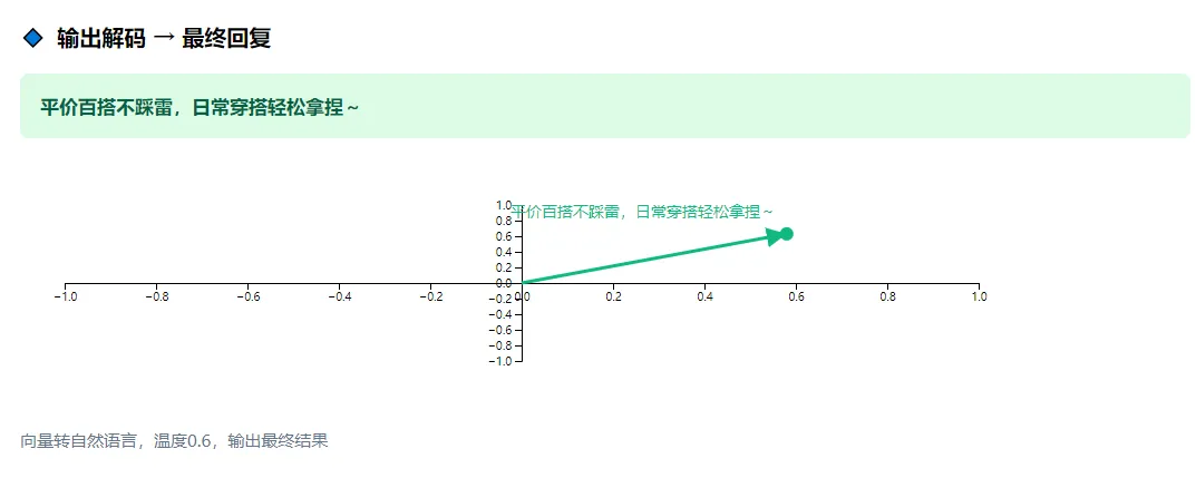 4.输出解码:将模型生成的数字向量,转化为人类可理解的自然语言(即上述宣传语),同时因温度参数设为0.6(中等随机性),避免生成过于生硬或杂乱的内容,最终将这句话反馈给用户。
