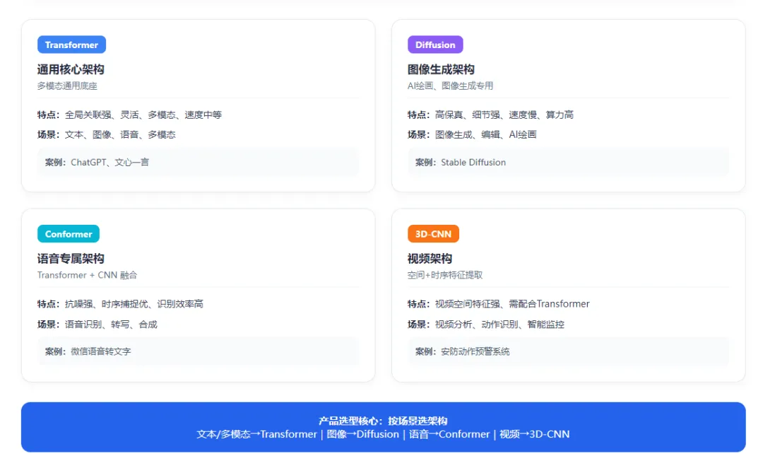 核心特点:擅长捕捉全局关联(文本的语义关联、图像的全局特征、语音的时序关联),灵活性强,可适配多模态融合,推理速度中等;