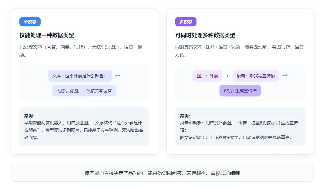 单模态【仅能处理一种类型数据的模型能力】:只处理文本(问答、摘要、写作)。案例:早期的智能问答机器人(如百度知道机器人),仅能处理文本输入,无法识别图片、语音,用户发送图片咨询“这个外套是什么颜色”,无法给出准确回复。