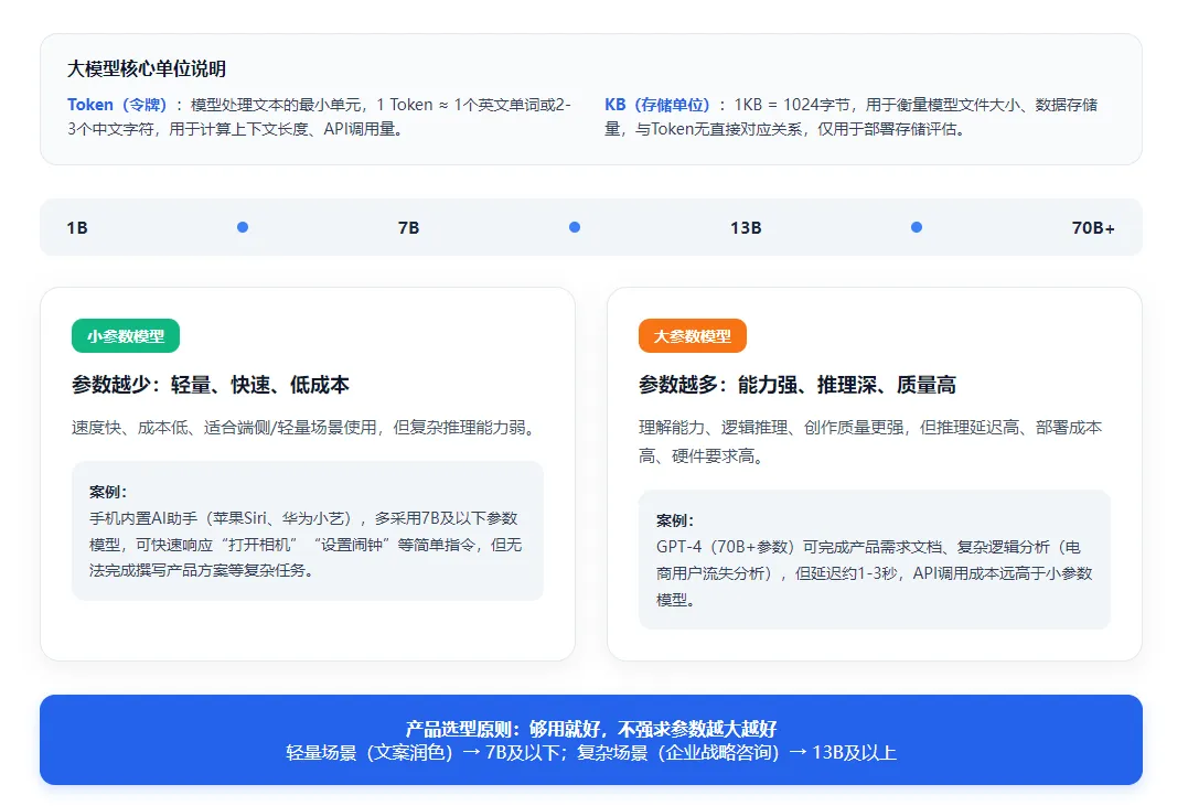 常见量级:1B~7B~13B~70B+【大模型核心单位说明——Token(令牌),即模型处理的最小单元,1个Token约等于1个英文单词或2-3个中文字符,用于计算上下文长度、API调用量】;KB【计算机存储单位,1KB=1024字节,用于衡量模型文件大小、数据存储量,与Token无直接对应关系,仅用于部署时的存储评估】参数越少,速度快、成本低、适合终端轻量使用,但复杂任务表现弱。案例:手机内置的AI助手(如苹果Siri、华为小艺),多采用7B及以下参数模型,能快速响应“打开相机”“设置闹钟”等简单指令,但无法完成复杂任务(如撰写完整的产品方案)。参数越多,模型理解、推理、创作能力越强,但更慢、更贵、更吃硬件。案例:GPT-4(70B+参数),能撰写完整的产品需求文档、进行复杂的逻辑推理(如“分析电商平台用户流失原因并给出解决方案”),但推理延迟较高(约1-3秒),API调用成本也远高于小参数模型。产品原则:够用就好,不强求参数越多越好。案例:做一款轻量的“文案润色助手”,仅需优化文案流畅度、修正语病,选用7B参数模型即可,速度快、成本低;若做一款“企业战略咨询助手”,需要复杂逻辑推理和专业分析,则需选用13B及以上参数模型。3. 上下文长度(上下文窗口)