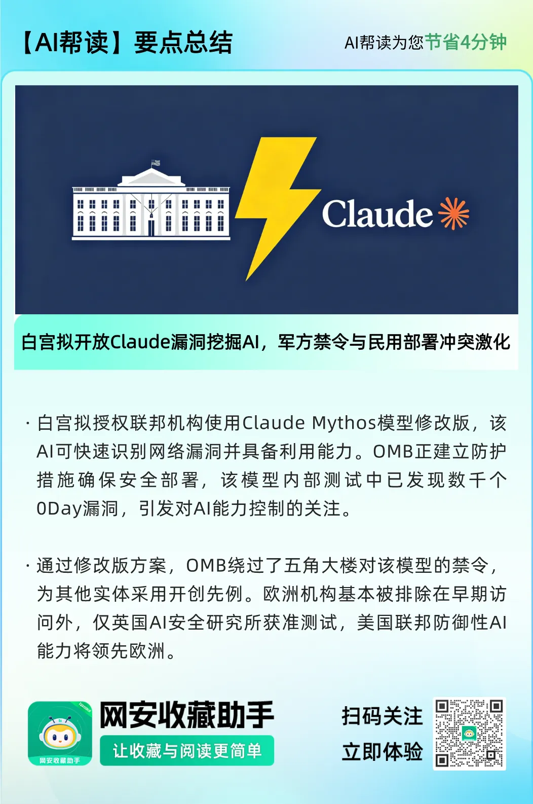 白宫拟开放Claude漏洞挖掘AI,军方禁令与民用部署冲突激化美国政府正计划授权主要联邦机构使用Anthropic公司Claude Mythos模型的修改版本。该AI模型能够快速识别网络安全漏洞并具备漏洞利用能力,引发了广泛关注。据彭博社援引内部备忘录报道,白宫管理与预算办公室(OMB)联邦首席信息官Gregory Barbaccia周二向内阁部门官员表示,OMB正在建立防护措施,允许联邦机构开始使用该模型。备忘录未指定具体部署机构或提供时间表。"我们正与模型供应商、行业合作伙伴及情报机构密切合作,确保在向各机构发布修改版模型前建立适当的防护栏和安全措施,"Barbaccia在邮件中写道。Part01防护措施界定备忘录提及的"修改版本"引发了关于实际部署形态的疑问。Anthropic于4月7日通过"Glasswing项目"发布了Claude Mythos预览版,该项目是针对特定科技和金融机构的受控访问计划。该公司称该模型在内部测试中发现了各大操作系统和浏览器的数千个0Day漏洞,并表示不计划全面开放该模型。"要使联邦部署具有防御性,修改必须涵盖特定的保障维度,"Counterpoint Research研究副总裁Neil Shah表示,"被扫描的软件代码库应在隔离的物理隔绝环境中保持主权,且数据不得用于重新训练基础模型。"他补充说,额外措施可能包括透明度要求和人工审核环节,以实现更可控的部署。Part02企业级影响这些保障问题直接关系到企业采购决策。OMB的举措表明,联邦网络防御正转向能够比人工团队更快发现漏洞的前沿模型。Shah指出,五角大楼与白宫之间的分歧为私营领域买家提供了重要启示。"两个政府实体间的分歧警示我们,控制可能被滥用的强大AI能力部署至关重要,"他呼吁建立涵盖发现、分类、安全、保障和行动的多层控制框架。这种不对称性已超越美国国界。欧洲机构基本被排除在早期访问之外,仅英国AI安全研究所获准测试该模型。若OMB按Barbaccia所述条款推进授权,美国联邦政府的防御性AI能力将领先欧洲,而五角大楼对同一供应商的禁令仍在司法程序中。Part03绕过五角大楼禁令的民用方案Shah表示,修改版方案是Anthropic在保持模型控制权的同时规避五角大楼立场的策略。"Anthropic修改版由此绕过了五角大楼非黑即白的做法,帮助其他实体在商定防护栏下将模型作为民用和企业主权的安全飞地采用。"他补充说,这种安排为Anthropic未来在其他政府实体和企业的采用开创了先例。联邦对Anthropic的访问权限已波动数周。3月26日,加州联邦地区法院针对平行民用禁令向Anthropic授予初步禁令,该裁决为承包商重新评估AI供应链提供了缓冲期。目前Anthropic同时面临军事采购黑名单、民用系统保留令,以及通过OMB扩大访问的讨论。承包商在识别特定AI模型在其技术栈中的位置时面临操作困难,这一挑战重塑了联邦AI部署中的供应链风险格局。参考来源:White House moves to give federal agencies access to Anthropic’s Claude Mythoshttps://www.csoonline.com/article/4160303/white-house-moves-to-give-federal-agencies-access-to-anthropics-claude-mythos.html推荐阅读电报讨论