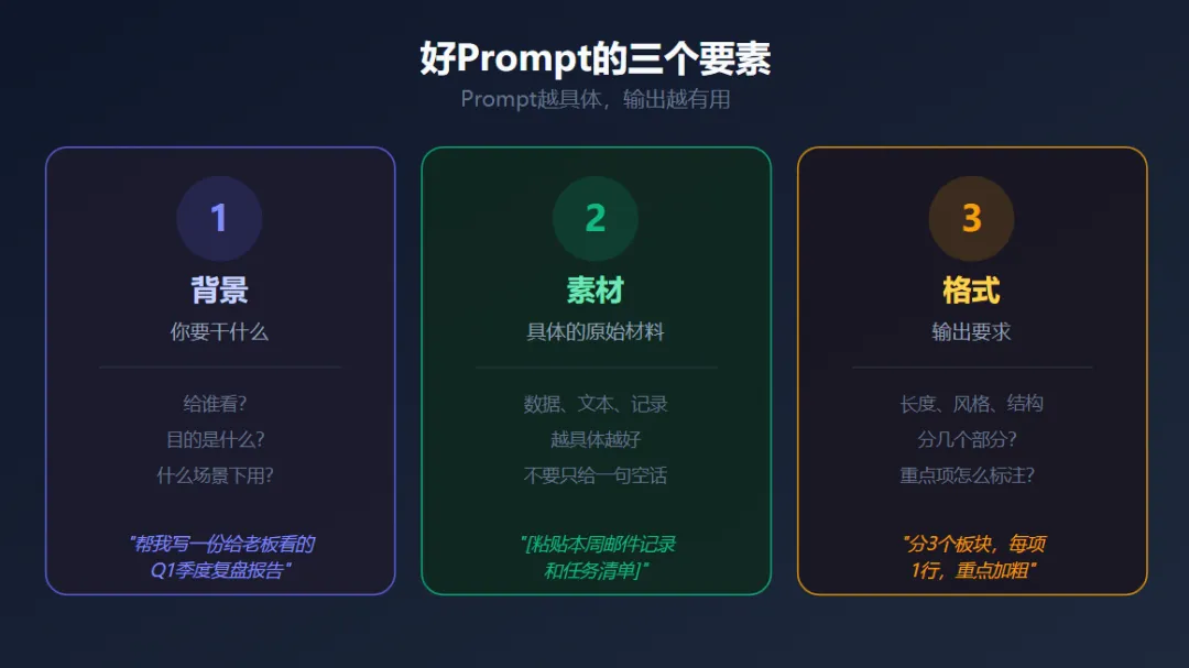 AI不是人,你不说清楚它就瞎写。好的Prompt必须包含三要素:
