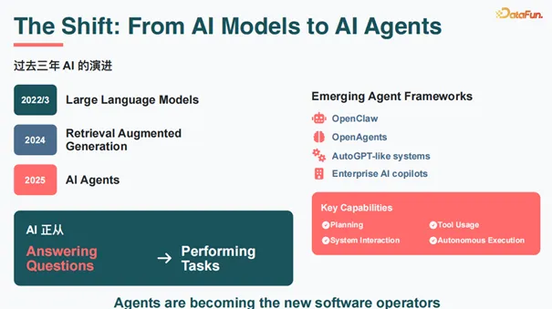 过去三年,AI 技术经历了清晰的演进轨迹。2022 年底 ChatGPT 引爆了大语言模型革命,业界关注模型能力竞赛。2024 年,RAG(检索增强生成)成为热点,核心是如何将大模型与企业数据结合。2025 年,AI Agents 成为主流,从 Menus 到 OpenClaw,标志着 AI 从"回答问题"(Answering Questions)进化到"执行任务"(Performing Tasks)。