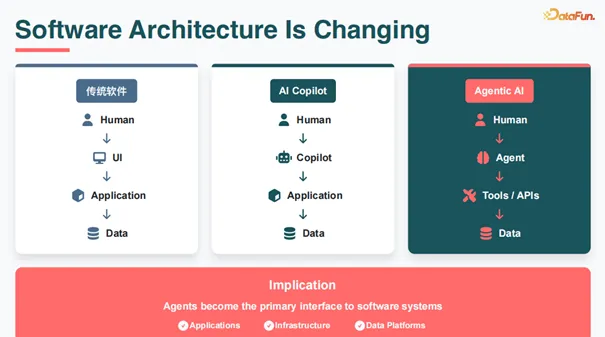 而在 Agentic AI 阶段,架构逻辑发生了根本改变。Agent 通过推理和规划,直接调用标准化工具套件,直接访问数据层,完全绕过了传统的应用中间层。这意味着应用层、基础设施层,尤其是数据平台,整个逻辑都需要基于全新范式重构。Agents become the primary interface to software systems(Agents 成为软件系统的主要接口)。
