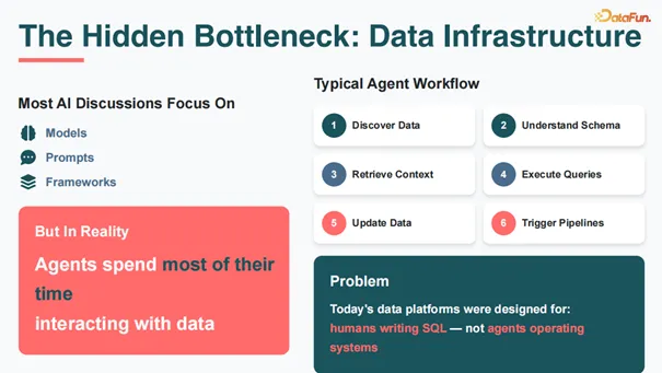 观察 Agent 工作流程会发现:它需要发现数据、理解 Schema、检索上下文、执行查询、更新数据、触发数据管道。Agents 将大部分时间花在与数据交互上(Agents spend most of their time interacting with data)。然而真正的瓶颈在于:今天的数据平台是为人类编写 SQL 设计的,而不是为 Agents 操作系统设计的。如果数据系统没有做好准备,Agent 的操作将是错误的、危险的、不安全的。