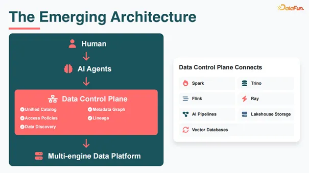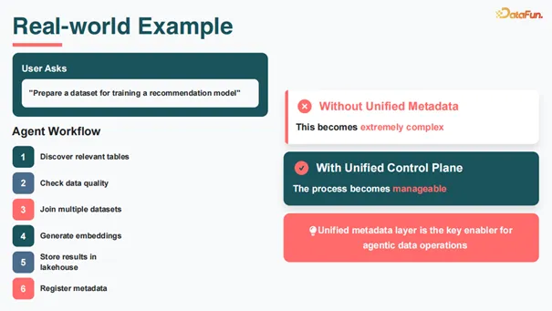 没有统一元数据,这会变得极其复杂(Without Unified Metadata, this becomes extremely complex)。Agent 需要与数据库、数据仓库、AI系统等多个异构系统分别交互。但有了统一控制平面,所有操作通过统一接口完成。统一元数据层是 Agent 数据操作的关键使能器(Unified metadata layer is the key enabler for agentic data operations)。
