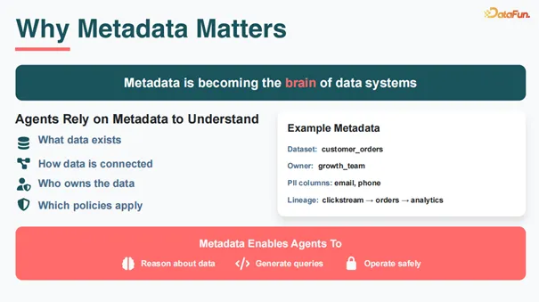 如果没有这样一层把信息聚合在一起,Agent就无法理解数据的含义和用法。Agent 依赖元数据理解:什么数据存在(What data exists)、数据如何连接(How data is connected)、谁拥有数据(Who owns the data)、哪些策略适用(Which policies apply)。基于元数据,Agent 能够推理数据(Reason about data)、生成查询(Generate queries)、安全操作(Operate safely)。
