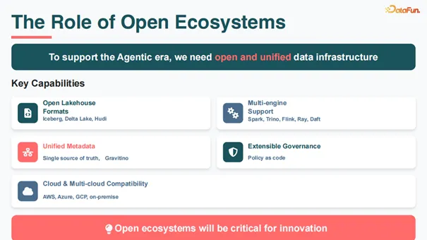 为支持 Agent 时代,我们需要开放和统一的数据基础设施(To support the Agentic era, we need open and unified data infrastructure)。这包括开放湖仓格式(Iceberg、Delta Lake、Hudi 等已成为标准)、多引擎支持(Spark、Trino、Flink、Ray 协同工作)、统一元数据平台(Apache Gravitino 作为单一真实来源)、可扩展治理(策略即代码方式)、多云原生支持(AWS、Azure、GCP、混合云环境)。这些开放组件构成完整的生态系统,支持企业级环境中 AI Agent 的持续创新。