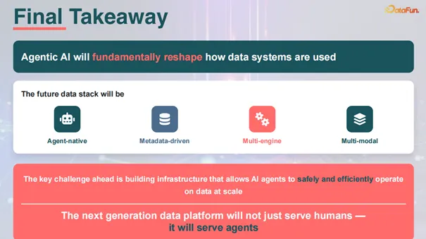下一代数据平台不仅服务人类,更服务 Agents(The next generation data platform will not just serve humans — it will serve agents)。关键挑战在于构建能让 AI Agents 安全、高效地大规模操作数据的基础设施(The key challenge ahead is building infrastructure that allows AI agents to safely and efficiently operate on data at scale)。
