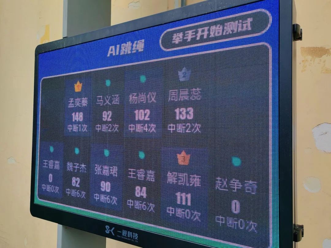 在跳绳测试区,学生们轻快跳跃、奋力挥绳,无需老师人工计数,每个人的实时跳绳次数、运动时长清晰展现在大屏之上,成绩一目了然;跑道区域内,学生只需站在起跑线举手示意,AI系统便自动发令,精准计时、即时排序成绩,告别了人工掐表的烦琐与误差。