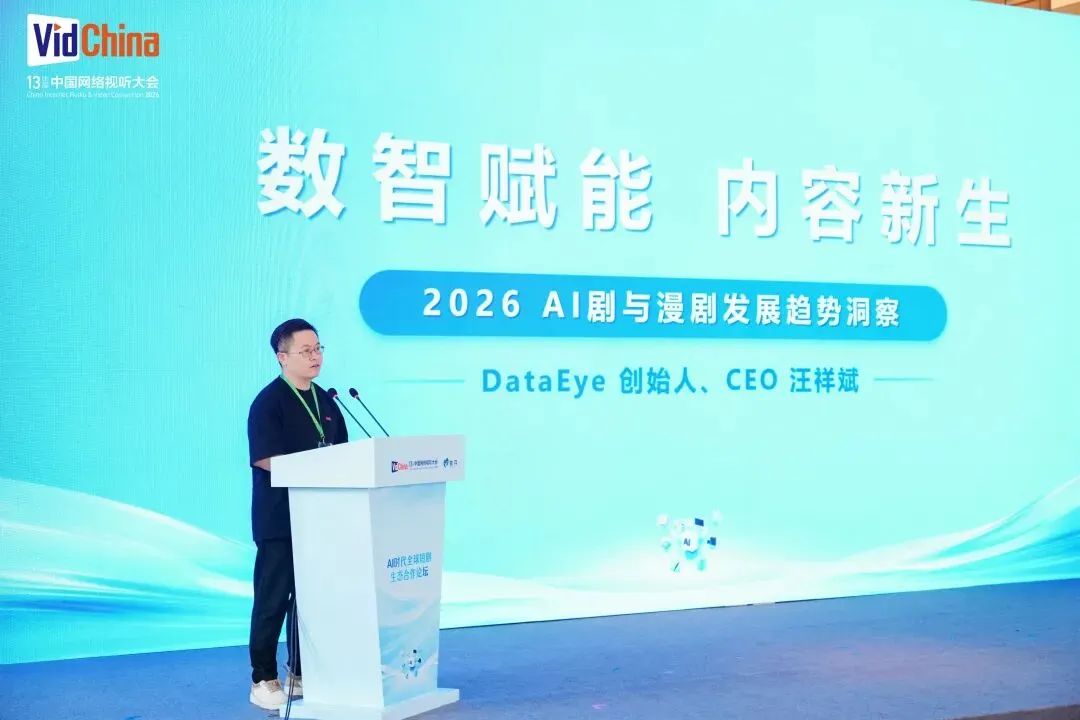 DataEye剧查查创始人兼CEO汪祥斌发布2026年AI剧与漫剧发展趋势。数据显示,Q1在播AI剧目已达10多万部,3月整体播放量超750亿,几乎超过去年全年。他认为AI带来了超级生产力,但也加剧了竞争,未来产业将形成二元化,头部稀缺价值放大。AI仿真人剧成为新品类,大模型迭代让微表情成为可能,未来创作门槛将无限降低,可能迎来全民创作时代。