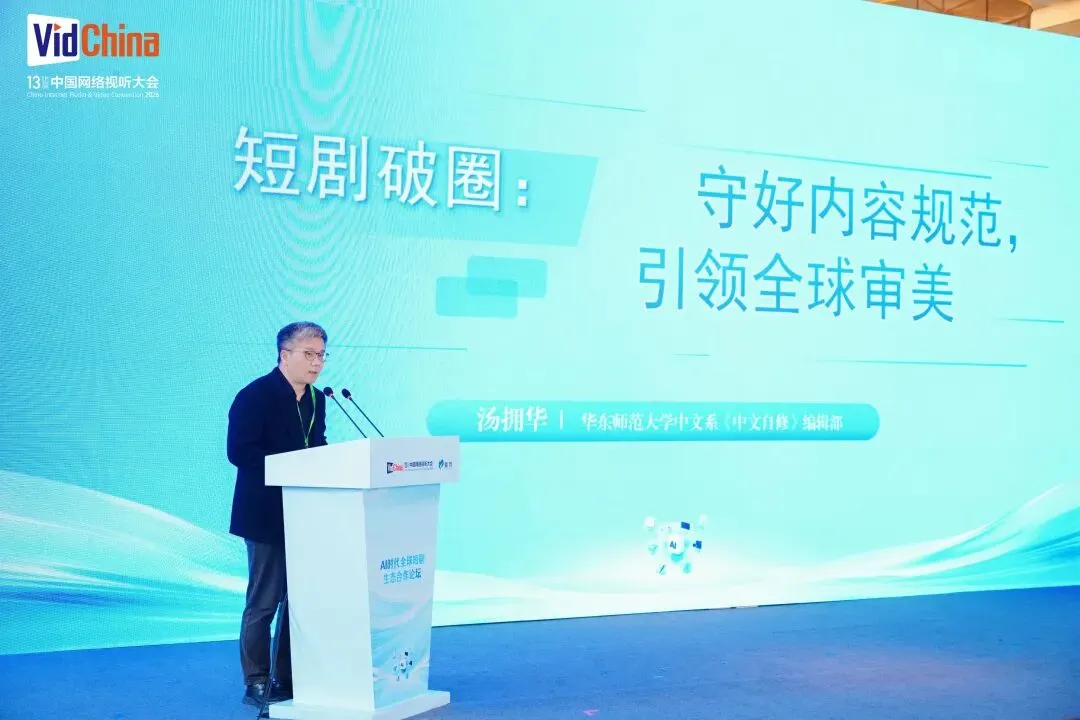 华东师范大学中文系教授汤拥华从学术视角解读了短剧破圈与全球审美。他认为短剧已经成为一种独立的文化形态,需要守护内容规范、呵护情感,同时引领全球审美。他提出短剧应当“不遮掩美但不要物化人”“不和稀泥但不要消费恨”“可以世俗但不要夸耀恶”“可以套路但不能太无聊”,并期待短剧成为日常生活的固有内容、娱乐文化的基本板块和当代思想的活力地带。
