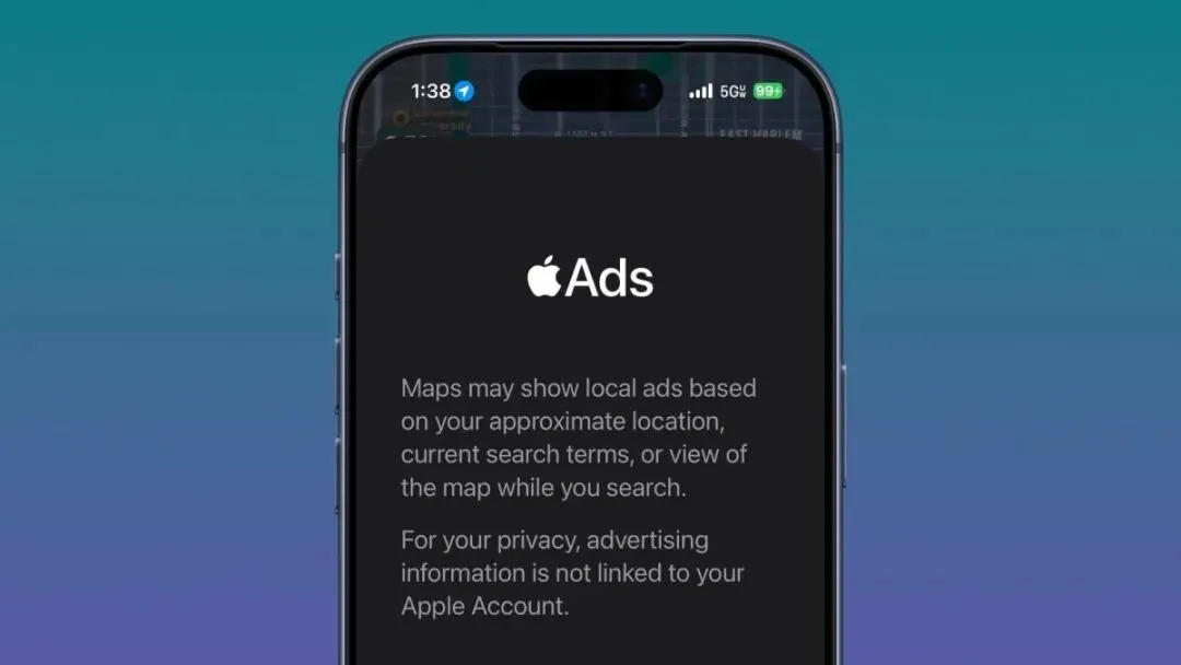 更新到iOS 26.5 Beta 2 后,打开Apple 地图会跳出一个「广告提示」,内容说明「地图可能会根据你的大约位置、目前的搜寻词汇或搜寻时的地图画面来显示当地广告」。