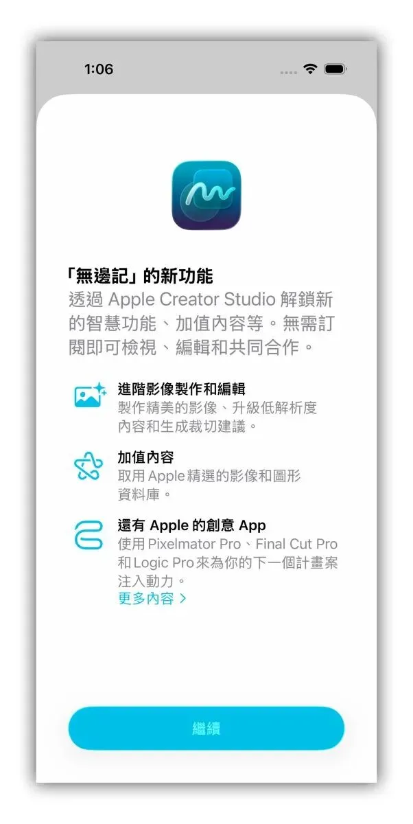 无边记App 作为Apple Creator Studio 的其中一环,付费订阅后可享有额外的进阶功能;在iOS 26.5 Beta 2 苹果也为无边记App 新增一个介绍进阶功能的画面,说白了应该就是要吸引用户来订阅。
