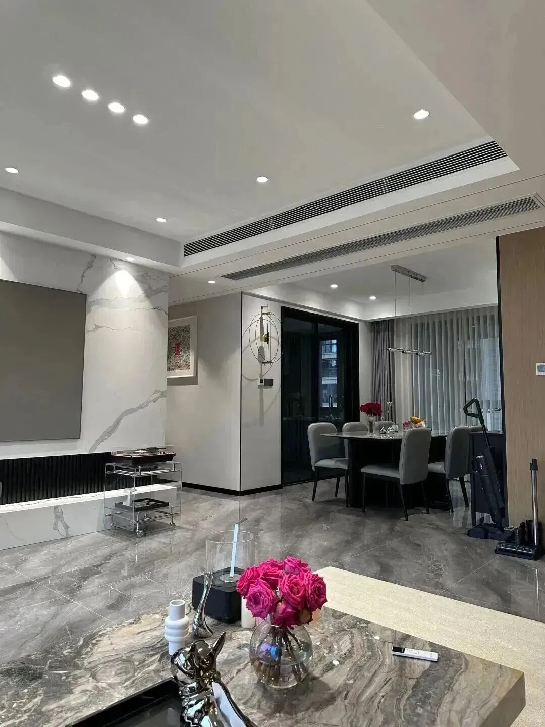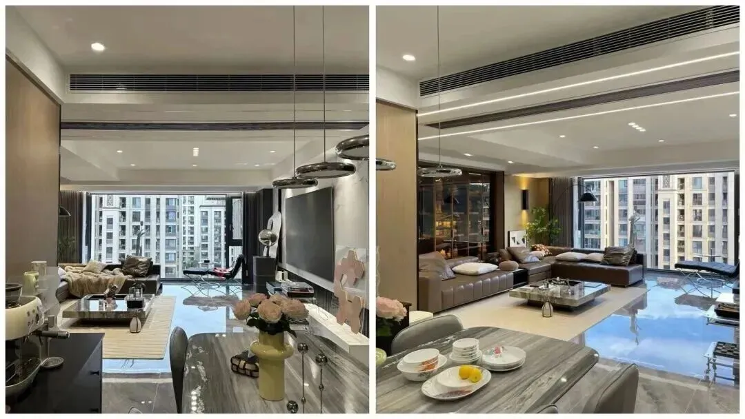 先说所谓风格底色,大部分人翻车就是把风格当成配色方案,觉得大理石就是轻奢,木头就是原木,其实真正决定气质的,是比例和留白,这个客厅没有乱七八糟的造型墙,顶面也就是简单的两道线条和中央空调出风口,墙、顶、地这三块都是大面积中性色,灰、白、木色把舞台搭好,后面换抱枕、换花、甚至把茶几换掉都不伤整体,这才叫底色。