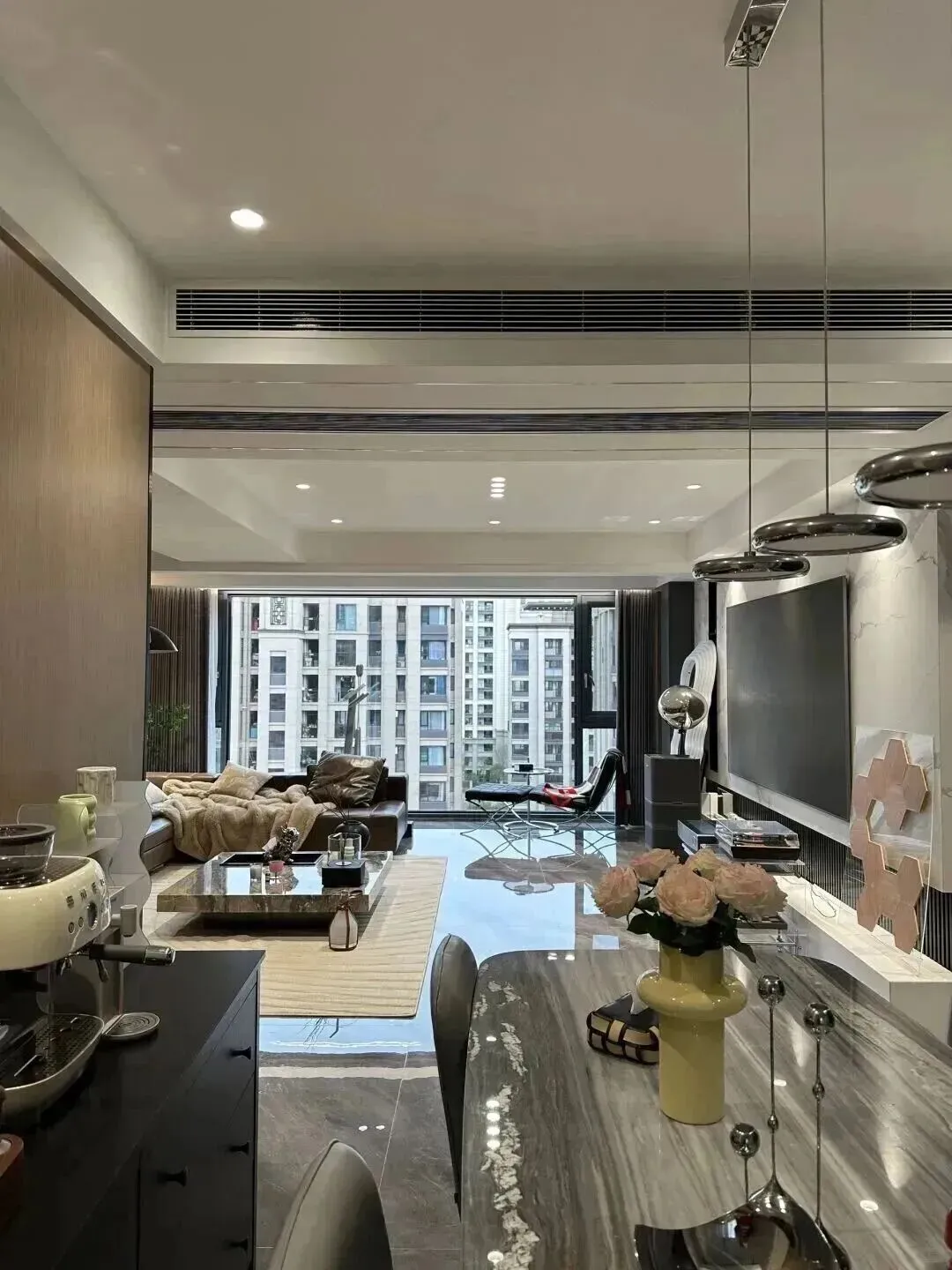 还有采光,很多人花好几万做氛围灯,结果窗帘选了厚不拉几的深色,白天家里昏昏沉沉,这个客厅则是把最大的那面窗完全让出来,没有多余隔断,窗前放的都是矮家具,光线一路泼进来,灰色高亮地砖甚至能映出楼下的天,把空间又偷偷抬高了半米,灯只是晚上补充情绪,而不是白天用来救场。