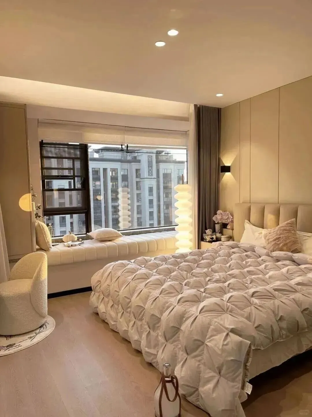 卧室更说明问题,很多人嫌自己卧室俗气,是因为还在用客厅那一套思路,这里直接换了一种语气,墙面用大面积米色软包,地面换成木地板,灯光色温压到3000K左右,床、飘窗、椅子都软乎乎的,一眼就知道这是用来休息的地方,不是拍照打卡的场景,风格服务的是状态切换,而不是照片好不好看。