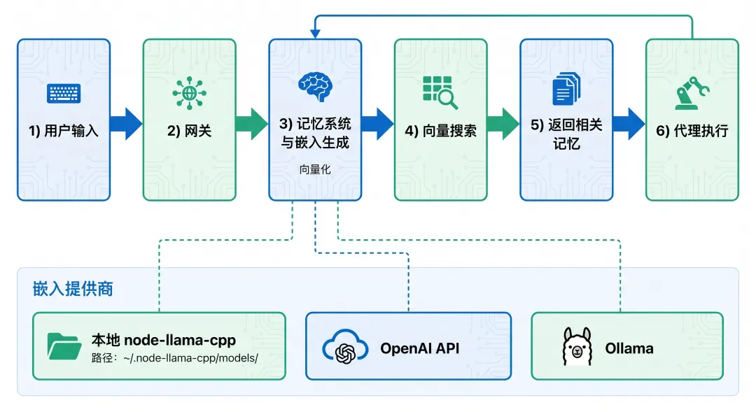 然后去搜 "node-llama-cpp",看到 llama.cpp,下意识以为这玩意儿是跑大模型的。node-llama-cpp 和 Ollama 完全不是一回事。在讲 node-llama-cpp 之前,必须先搞清楚 OpenClaw 的记忆系统是怎么工作的。OpenClaw 的记忆系统采用 向量检索 机制:用户输入 → 转为向量 → 在记忆库中搜索相似内容 → 返回相关记忆 → 注入上下文