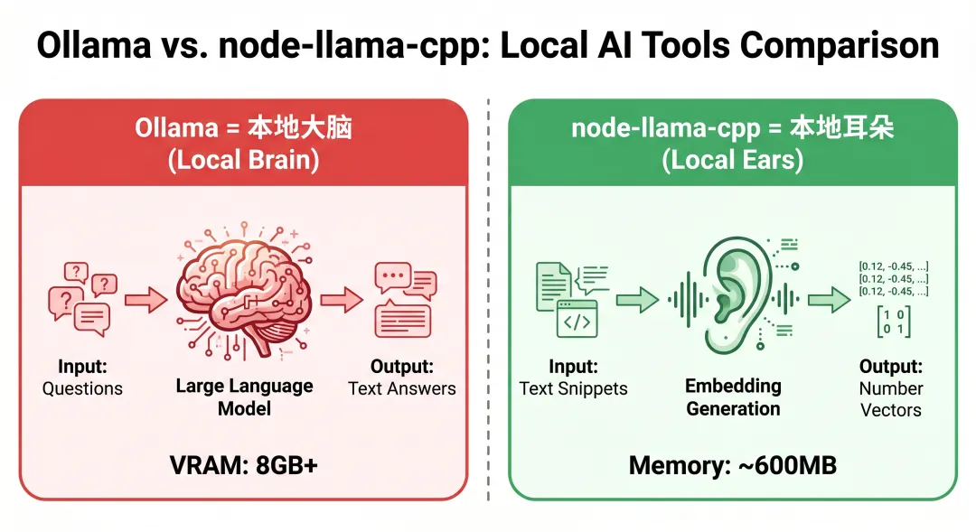 node-llama-cpp = 本地耳朵(听清你说的话)图2:Ollama 与 node-llama-cpp 对比 - Ollama 负责 LLM 推理(8GB+ 显存),node-llama-cpp 负责 embedding 向量生成(~600MB)- C++ 编译依赖复杂:node-llama-cpp 需要编译 native 扩展,涉及 llama.cpp 的 C++ 代码