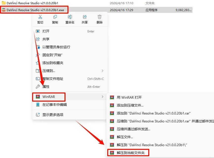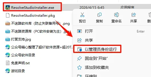 2.打开刚刚解压的文件夹,鼠标右键点击“ResolveStudioInstaller.exe”选择“以管理员身份运行”