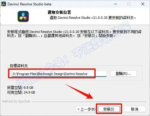 4.选择软件安装路径,建议和教程中的保持一致,本例安装到D盘(将路径地址中的首字符C改为D表示安装到D盘,安装路径不要出现中文),点击“安装”