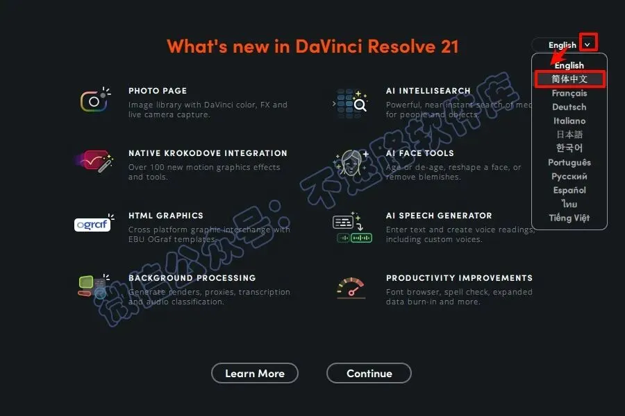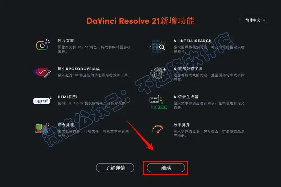 DaVinci Resolve v21 版本是一次重大更新,新增 “照片”页面,将电影级调色能力扩展至静态图像处理;引入 IntelliSearch 智能元数据搜索、CineFocus 自动焦点调整、Magic Mask 改进版 AI 抠像 等多项 AI 功能,并对关键帧系统、多主控调色、Fusion 节点图性能及 Fairlight 音频工作流进行全面优化。Studio 版支持 8K 全分辨率处理、Dolby Vision 认证、远程协作及硬件加速编码,是专业影视制作的终极选择。