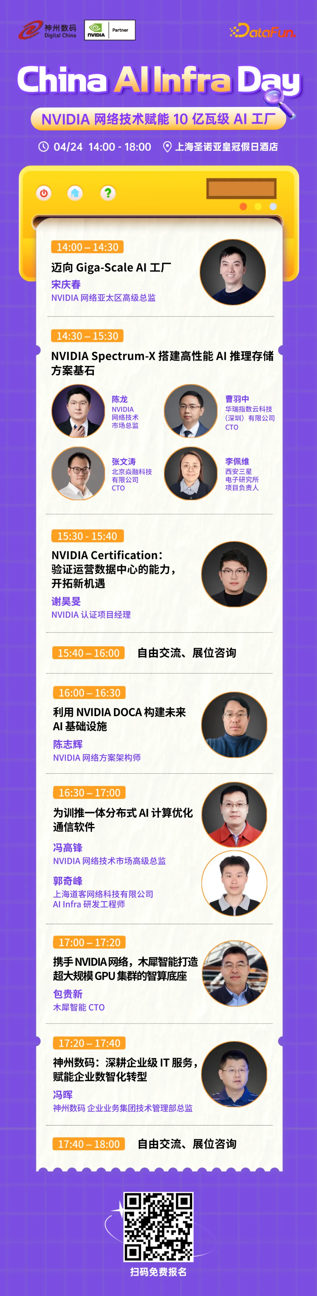 4月24日,14:00-18:00,诚邀您参加China AI Infra Day专场论坛,届时将邀请来自NVIDIA、神州数码、三星半导体、焱融科技、华瑞指数云、西安三星电子研究所、道客、木犀智能等企业的嘉宾,就相关内容分享前沿技术与最佳实践,感兴趣的小伙伴,欢迎扫码报名,参与专场论坛。