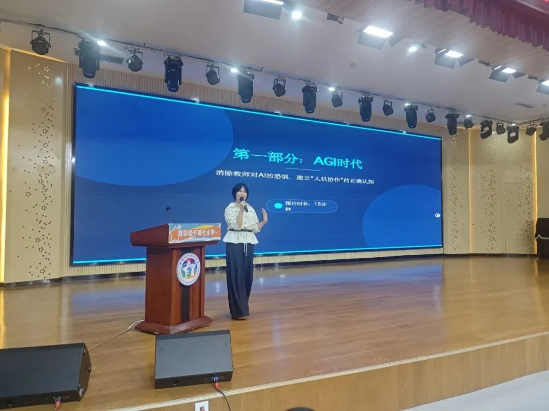 近期,西安经开第七小学报告厅内150余名教师齐聚一堂,共同开启了一场以“AGI赋能教学——教师必备的AI应用能力”为主题的专题培训。这标志着我司与西安经开第七小学携手推进的 “2025-2026年‘星光AI’科技教育特色学校共建项目” 正式进入师资赋能实施阶段。