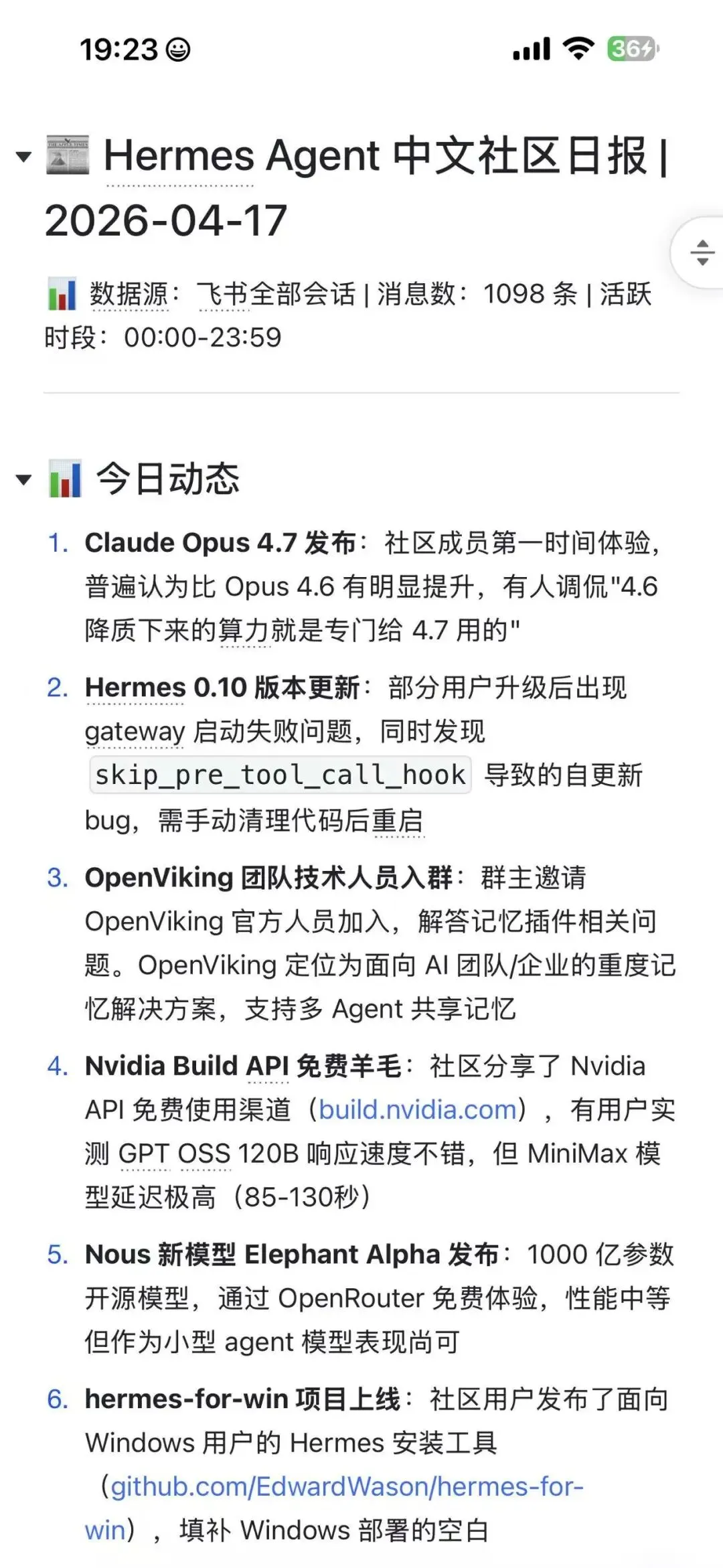 日报:每天早上7点半自动生成。我在飞书群里看到的就是这样: