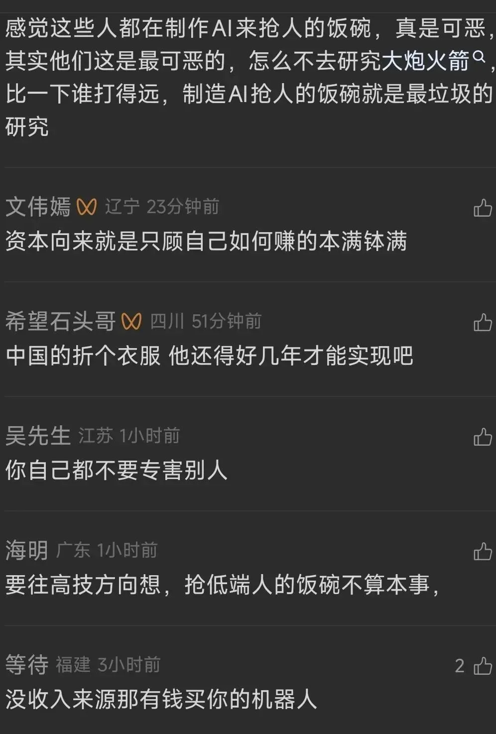 服务于人的东西/产品是人搞出来的,又在不断攻击人类同胞,制造焦虑左右手互搏,以彼之矛攻彼之盾,造成时代惊慌的从来不是技术革新ai替代性,而是套着ai话题不断加码煽风点火的人!