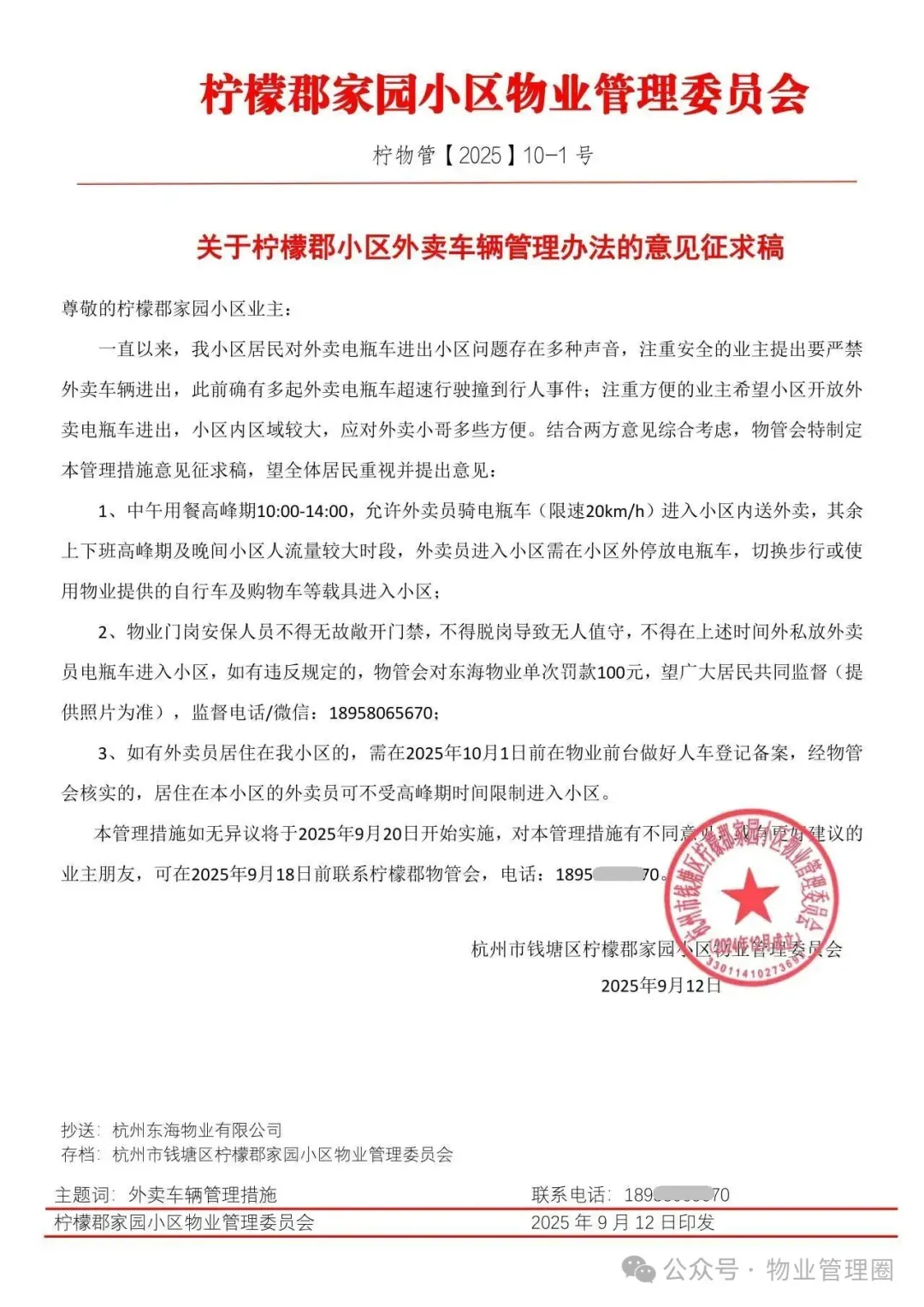 物业对小区外卖车辆的管理办法(模板)自禁止外卖车辆进入小区的规定试行以来,物业收到了许多业主的反馈与建议。为更好地平衡小区安全管理与业主日常生活需求,现对该规则做出如下调整:1.夏季:允许外卖车辆在22:00-次日6:00进入小区2.冬季:允许外卖车辆在20:00-次日6:00进入小区3.雨天:遇下雨天,外卖车辆可全天进入小区,但骑手务必谨慎慢行,注意行车安全。除上述允许外卖车辆进入的时间段外,其他时间外卖员可选择使用物业提供的短驳车辆。1.进入小区的外卖车辆必须遵守小区内的交通规则,限速行驶,注意避让行人,特别是在夜间行驶时,禁止鸣笛,避免影响业主休息。2.外卖骑手需配合门岗工作人员的检查与登记工作。。3.对于不配合管理,强行闯入或超速行驶的外卖车辆,物业将采取劝阻、登记备案,禁止驶入本小区等措施。希望通过此次规则调整,既能保障小区居民的生活秩序与安全,又能最大程度满足大家接收外卖的便利性需求。
