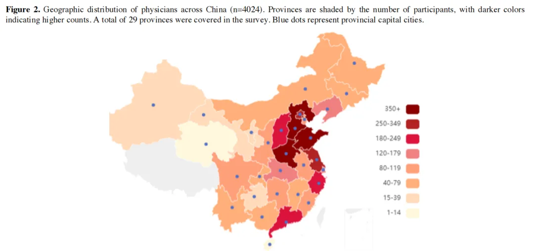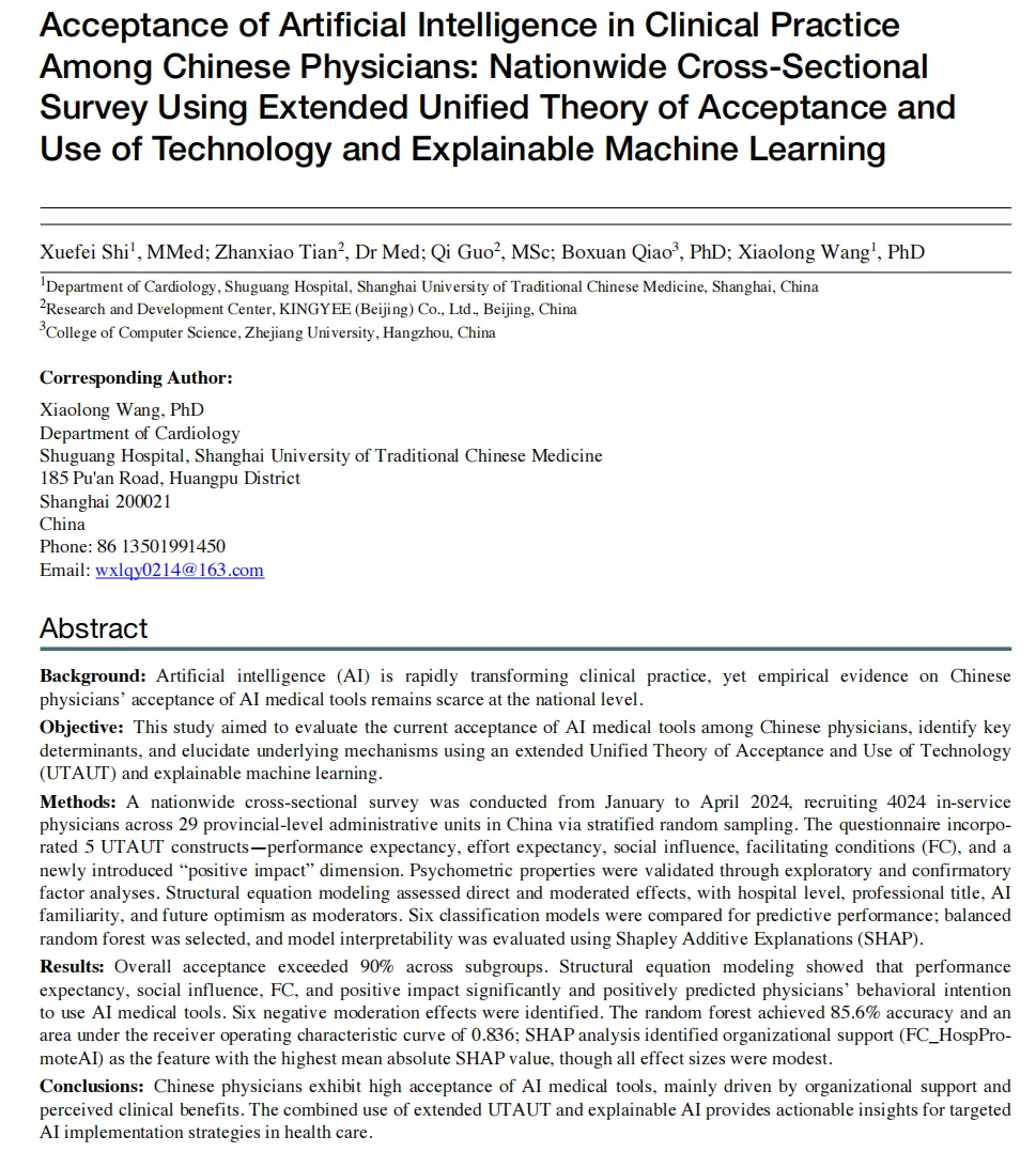 本研究通过覆盖全国29个省级行政单元、4024名在职医生的横断面调查,系统评估了中国医生对AI医疗工具的接受意愿。结果显示,各亚组接受率均超90%,组织支持(医院积极推广AI)与感知临床价值是最核心驱动因素。研究融合扩展UTAUT模型与可解释机器学习,为医疗AI实施策略提供了循证依据。