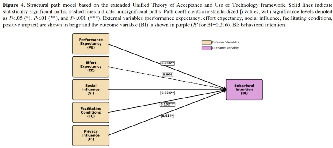 (β=.03,P=.001):医生感知AI能提升工作效率; - 社会影响 SI