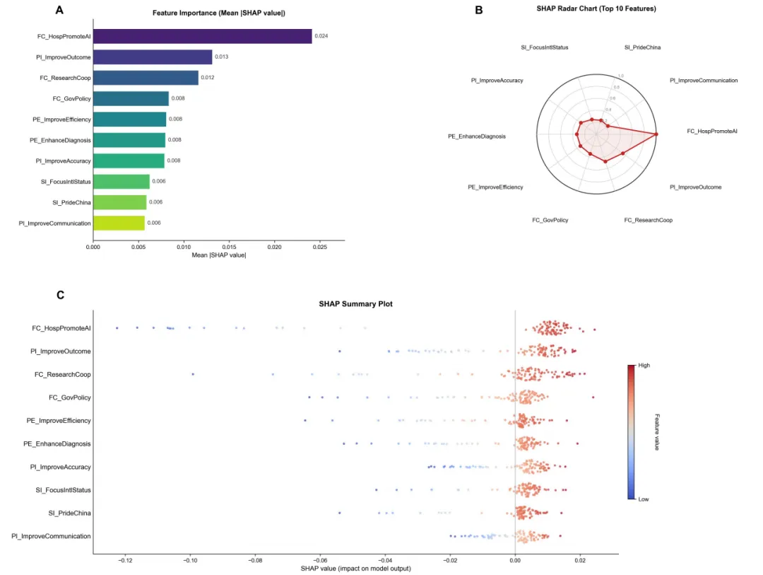 | 排名 | 特征代码 | 中文含义 | 平均|SHAP|值(约) ||------|---------|---------|-----------------|| 1 | FC_HospPromoteAI | 医院应积极推广AI医疗工具的使用 | ~0.024 || 2 | PI_ImproveOutcome | AI能帮助改善患者临床结局 | ~0.012 || 3 | FC_ResearchCoop | 研究机构应加强AI相关研究与合作 | ~0.011 || 4 | FC_GovPolicy | 政府应出台政策促进医疗AI应用 | ~0.009 || 5 | PE_ImproveEfficiency | AI医疗工具能提升医疗效率 | ~0.008 || 6 | PE_EnhanceDiagnosis | AI医疗工具能增强医生诊断能力 | ~0.007 || 7 | PI_ImproveAccuracy | AI能提高诊断准确性 | ~0.006 || 8 | SI_FocusIntlStatus | 我关注中国在医疗AI领域的国际地位 | ~0.004 || 9 | SI_PrideChina | 我为中国在医疗AI领域的快速发展感到自豪 | ~0.003 || 10 | PI_ImproveCommunication | AI能帮助改善医患沟通 | ~0.002 |