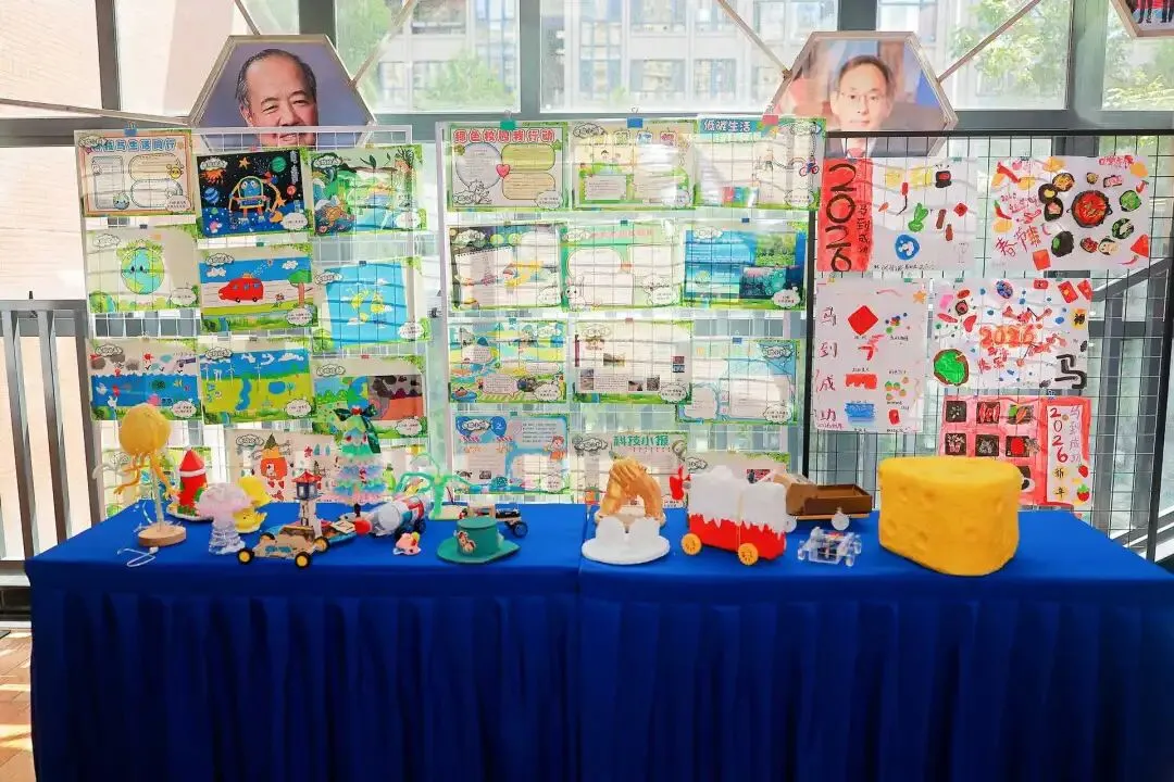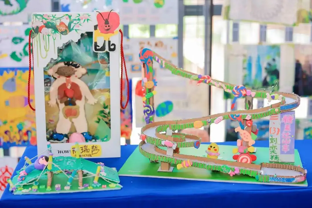 本次学生作品展从三月初启动布展,汇集科学课、信息科技课、STEAM 课程、六年级未来学校课程等日常成果,以及校外各项获奖作品,涵盖科技小制作、电脑绘画、电子小报、3D 绘画、AI 绘画、科学论文、创造发明等类别,超 400 件作品参展,用创意点亮校园每一处角落。