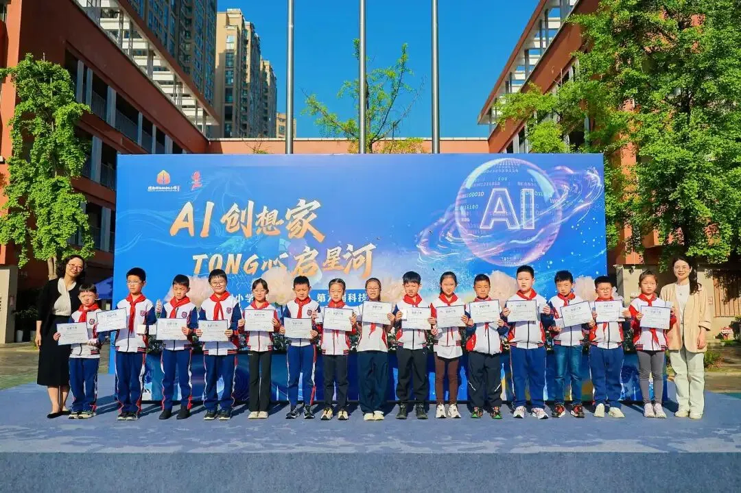 随后现场为三年级新晋的十五位小院士举行授牌仪式。小小院士承载科技梦想,以热爱为炬、以探索为路,成为校园科创先锋,用智慧与行动点亮 AI 时代的少年星光。