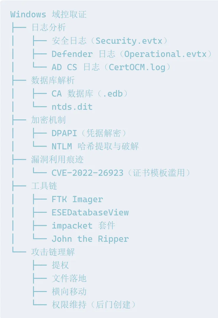 ⼀道典型的Windows域控(DC)安全取证题目,涵盖从攻击初始突破、权限维持、横向移动到后门建立的攻击链分析。考察⾯分析如下: