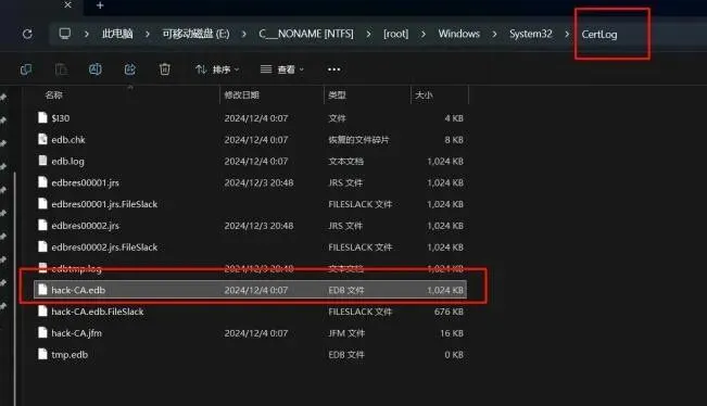 CertEnroll(位于certsrvCertEnroll):存放CA自动发布的证书( .crt)和撤销列表( .crl)文件 ,以及在Web注册或自动注册过程中生成的证书请求和响应。在certlog下面发现hack-CA的数据库