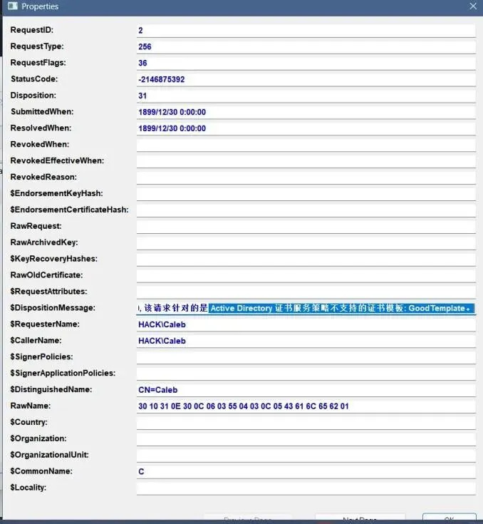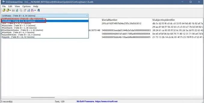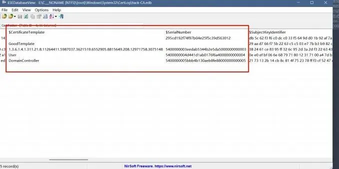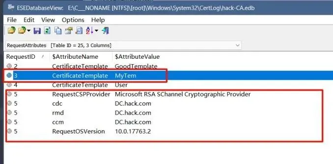 在CertoCM.1og中筛选成功操作,发现可疑模板名 hack-CA2. 使用数据库查看⼯具(ESEDatabaseView)打开CA数据库(hack-CA.edb)3. 关联 Request 表(查找成功的证书请求)和Certificate 表(获取对应的证书序列号),定位攻击者利⽤的恶意证书模板和颁发的证书。