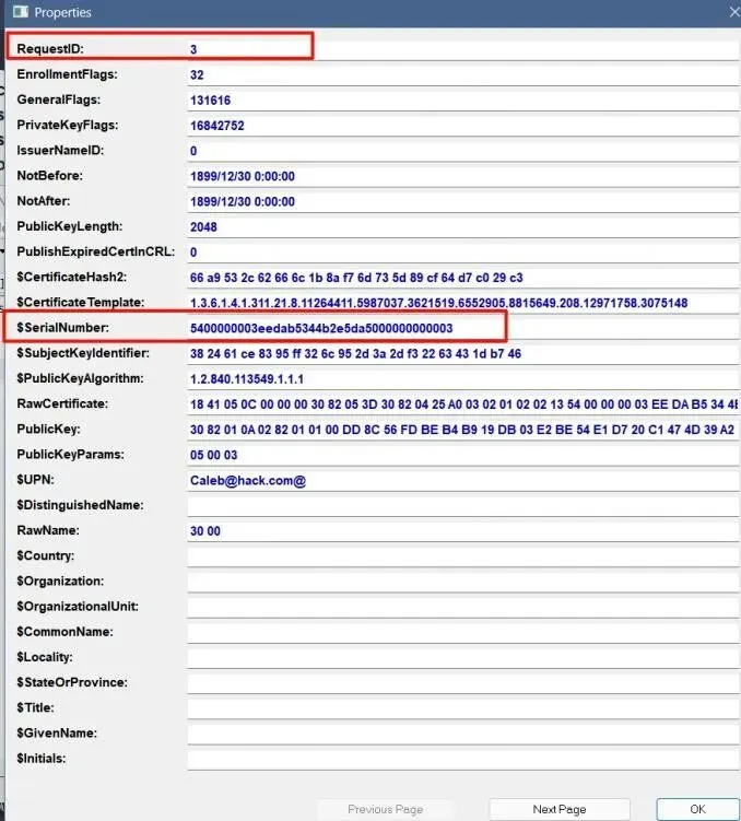 小梁的域控机器被黑客攻击了,请你找出⼀些蛛丝马迹。攻击者通过AD CS提权至域管理员,在攻击过程中,攻击者使⽤有问题的证书模版注册了一张证书,该证书的证书模版名、证书序列号是什么?(格式为模版名-序列号,如CertTemplate-2f0000 00064287f6f 5 d6ff4a91000000000006)