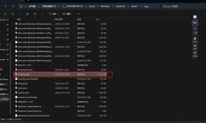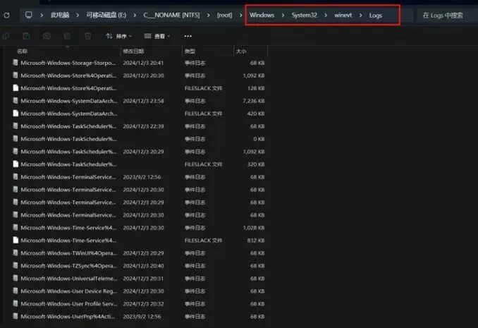 Logs目录中包含大量以.evtx为扩展名的文件 ,这些文件采用专有的二进制格怯存储事件记录 ,每个文件对应事件查看器( Event Viewer) 中的一个日志通道,如 Application.evtx、System.evtx、Security.evtx 等。